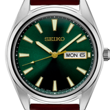 Men's SEIKO Essential Stainless Steel Quartz Watch with Brown Leather Band and Green Dial
